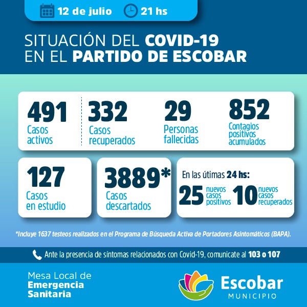 Situación local COVID-19 al 12 de Julio informada por la Municipalidad de Escobar
